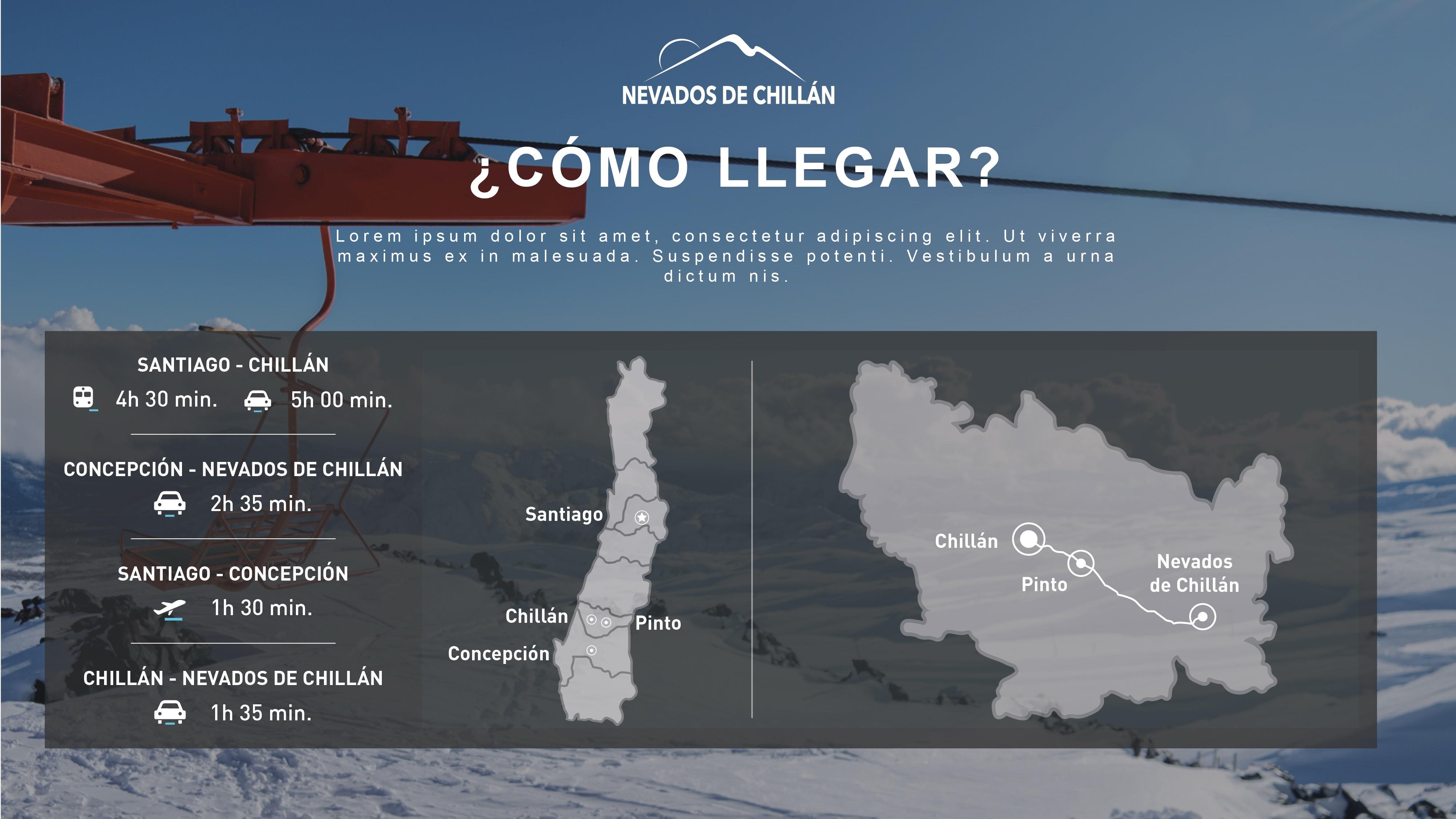 Nevados de Chillán esta ubicado en la cordillera de los Andes, en la región de Ñuble a 600 km de Santiago y a unos 85 km de la ciudad de Chillán. A unos de 8 km del Valle de Las Trancas. Puedes llegar con las siguientes alternativas de movilización: